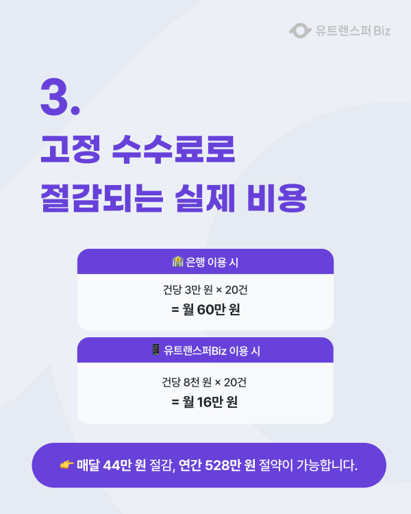 유트랜스퍼Biz로 고정 수수료 + 대량 송금 솔루션을 활용하면,