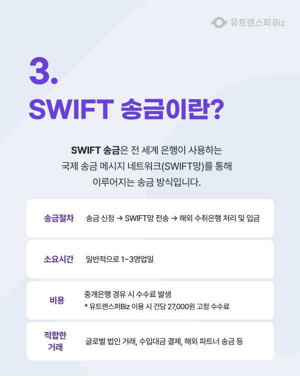 - SWIFT 송금 ➜ 글로벌 법인 간 거래에 유리