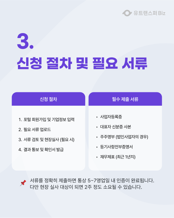 서류 제출 후 5~7영업일 내 인증을 완료할 수 있으며, 현장 실사가 필요하면 약 2주가 소요될 수 있습니다.