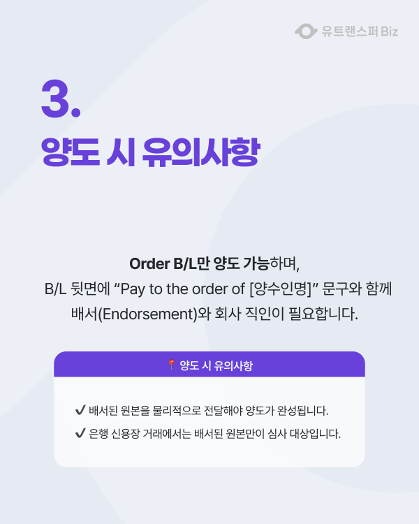 양도 가능 대상은 Order B/L 입니다. 배서 문구와 날인이 정확해야 해요.