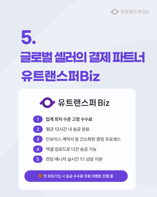 5️⃣ 글로벌 셀러의 결제 파트너, 유트랜스퍼Biz 💳