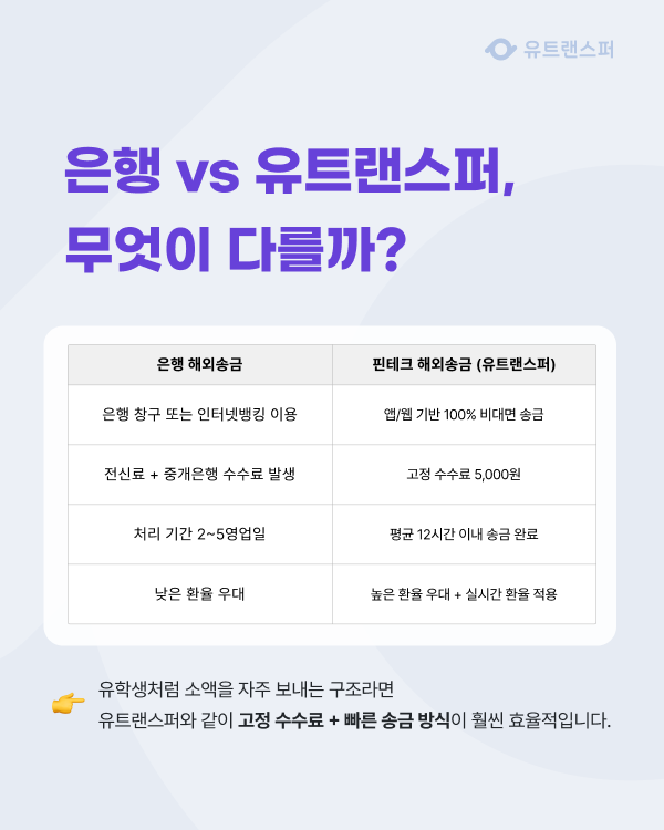 | 비교 항목 | 시중 은행 (Bank) | 핀테크 (Utransfer) |