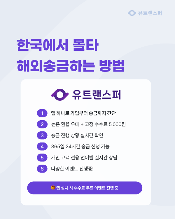유트랜스퍼의 투명한 환율 정책과 이벤트를 활용하여 가장 경제적인 송금을 경험해 보시기 바랍니다.