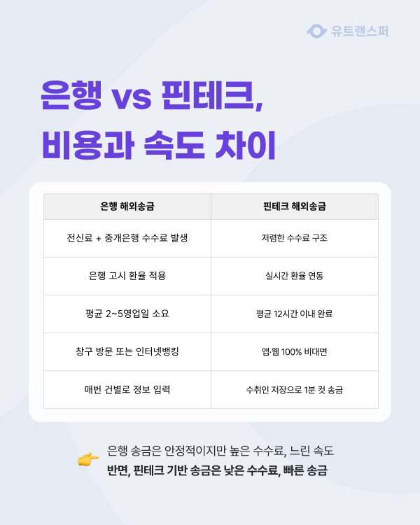 | 비교 항목 | 일반 시중 은행 (Bank) | 핀테크 플랫폼 (Utransfer 등) |