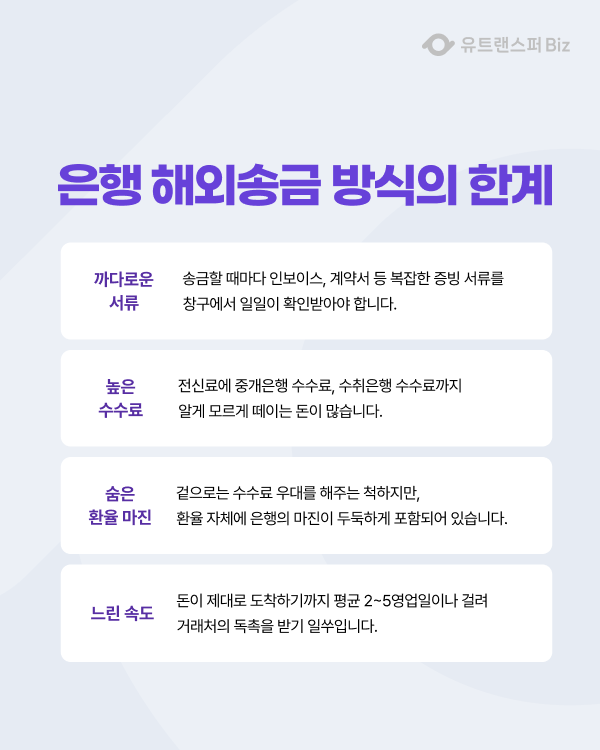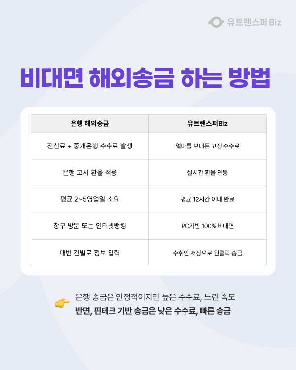 | 구분 | 일반 은행 해외송금 | 유트랜스퍼 Biz (기업 송금) |