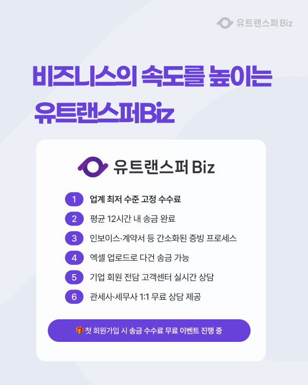 - 기업 송금은 유트랜스퍼 Biz: 사업자 맞춤형 대량 송금 및 효율적인 외환 정산 솔루션을 제공합니다.