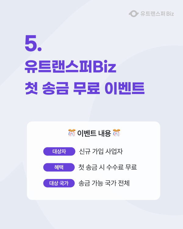유트랜스퍼Biz를 처음 이용하는 기업이라면, 첫 송금 수수료 무료 이벤트로 부담 없이 서비스를 체험할 수 있습니다.