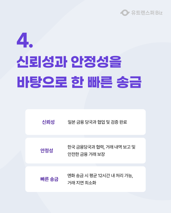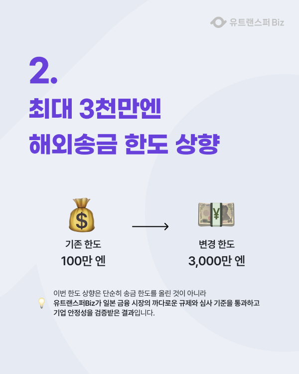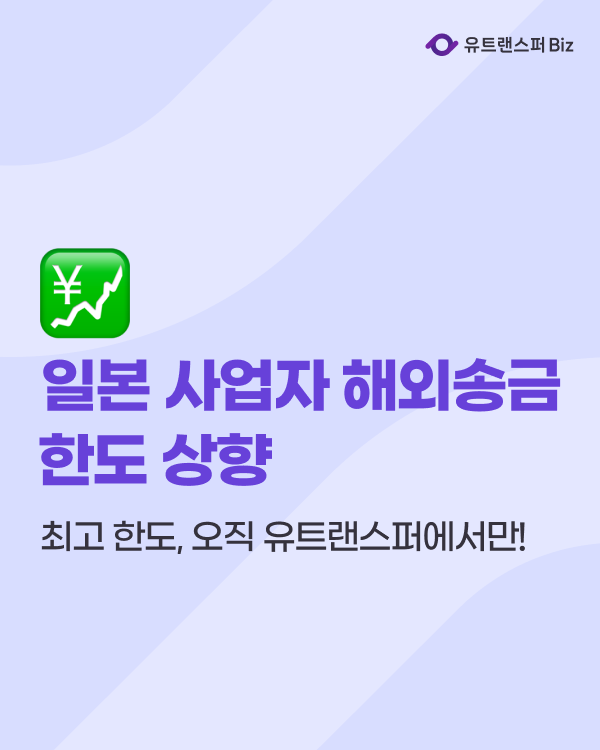 이번 한도 상향은 단순한 한도 증가가 아니라, 유트랜스퍼Biz가 일본 금융 규제와 심사를 통과하고 기업 안정성을 검증받은 결과이기 때문에 안심하고 송금할 수 있습니다.