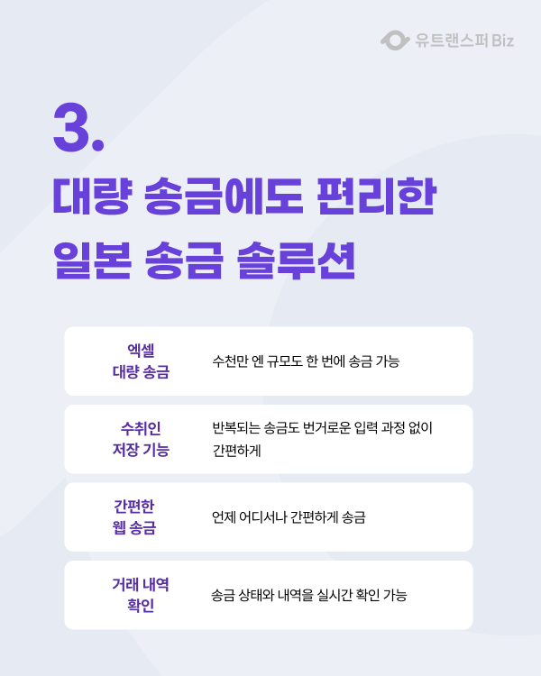 엔화 하락으로 일본 송금 수요가 높아진 지금, 유트랜스퍼Biz로 정기 송금과 대량 송금까지 효율적으로 관리해보세요.